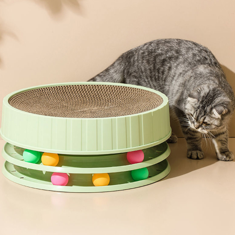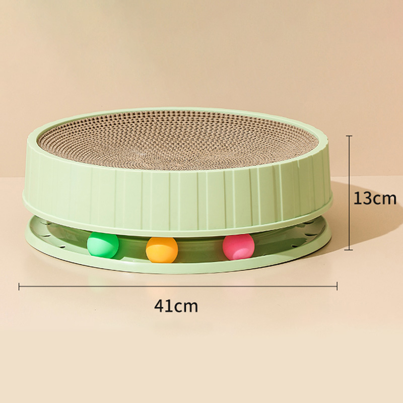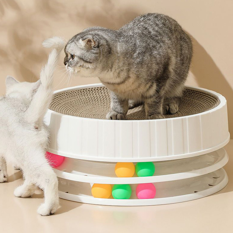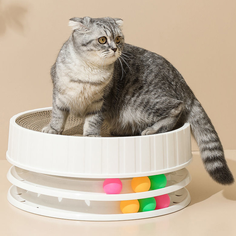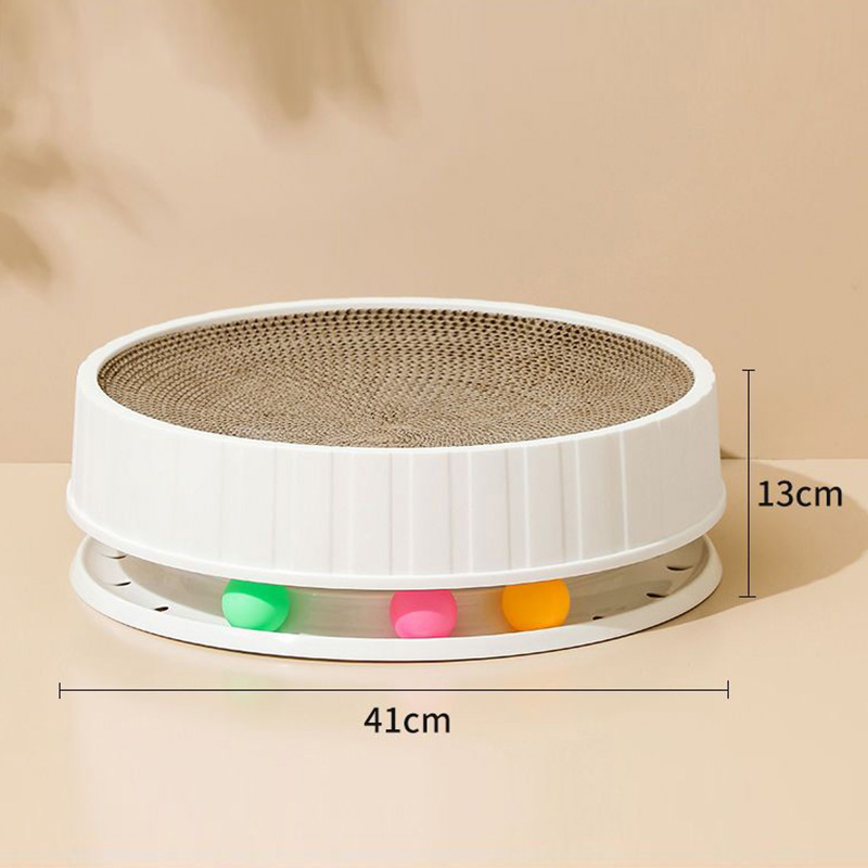 The upper layer features a corrugated texture that mimics the feel of natural materials, encouraging cats to scratch and hone their claws effectively. This texture can also help to remove loose fur and keep the cat's claws healthy. The lower layer, equipped with colorful balls, adds an interactive element that stimulates the cat's hunting instincts, making it not just a scratcher but also a toy.
