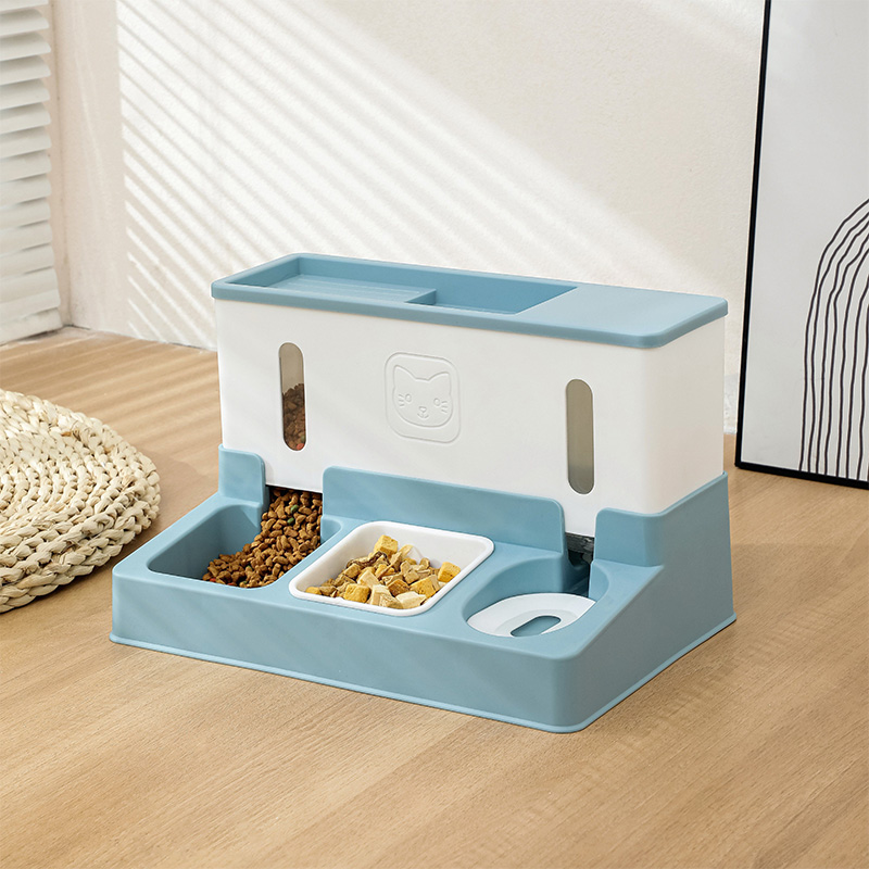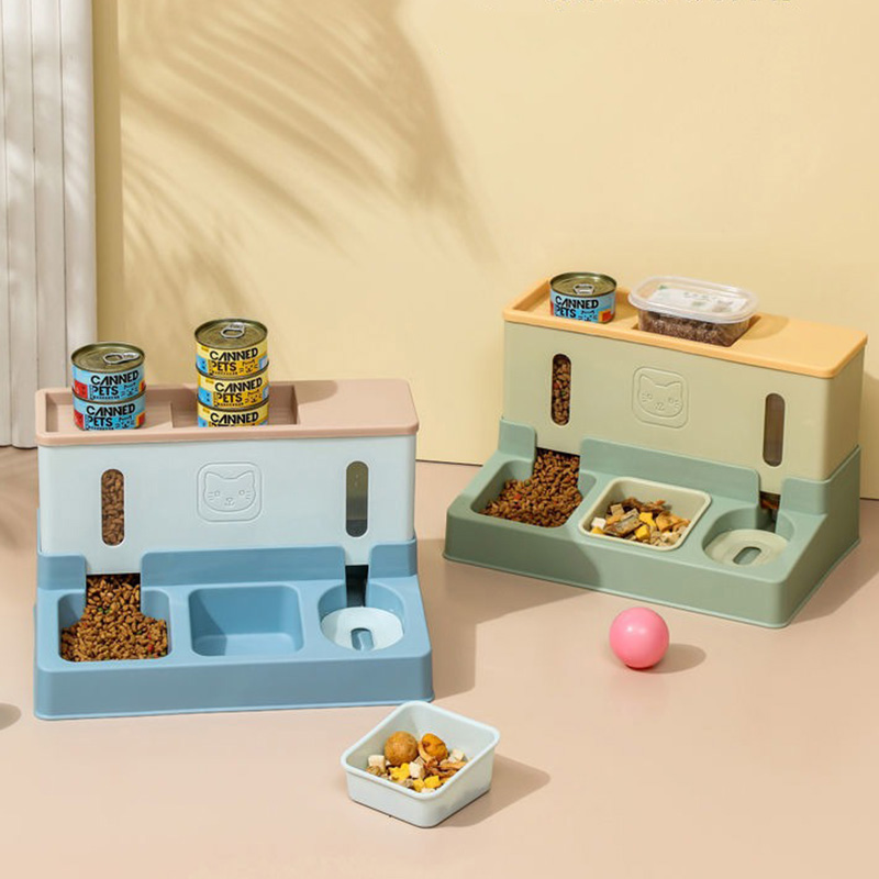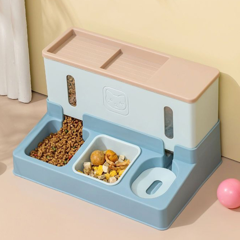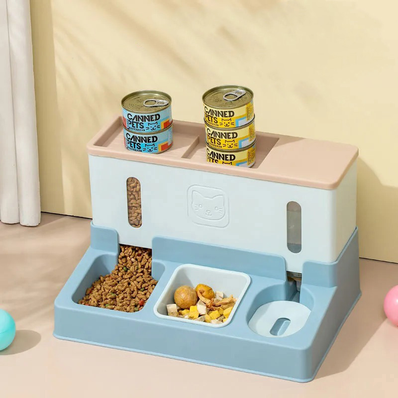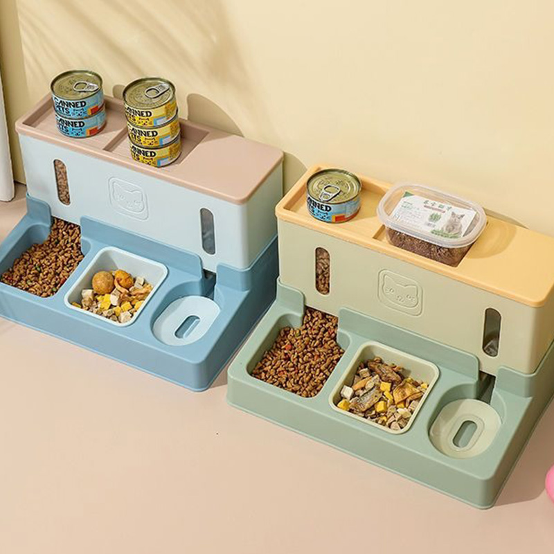 The feeder features two separate compartments, one for dry food and another for wet food, allowing pet owners to provide a balanced diet for their pets. The design is practical, with a raised platform that helps to keep the food clean and dry, reducing the risk of contamination from the ground. The house-shaped design not only adds an aesthetic appeal to the product but also provides a sense of security for pets, making them more comfortable while eating.