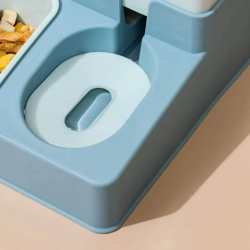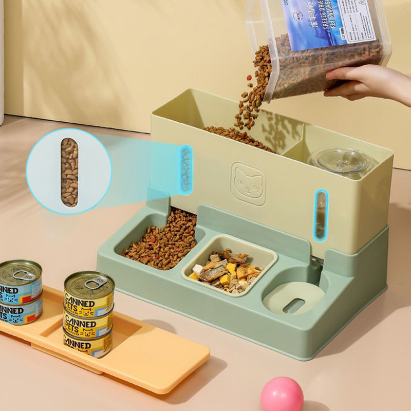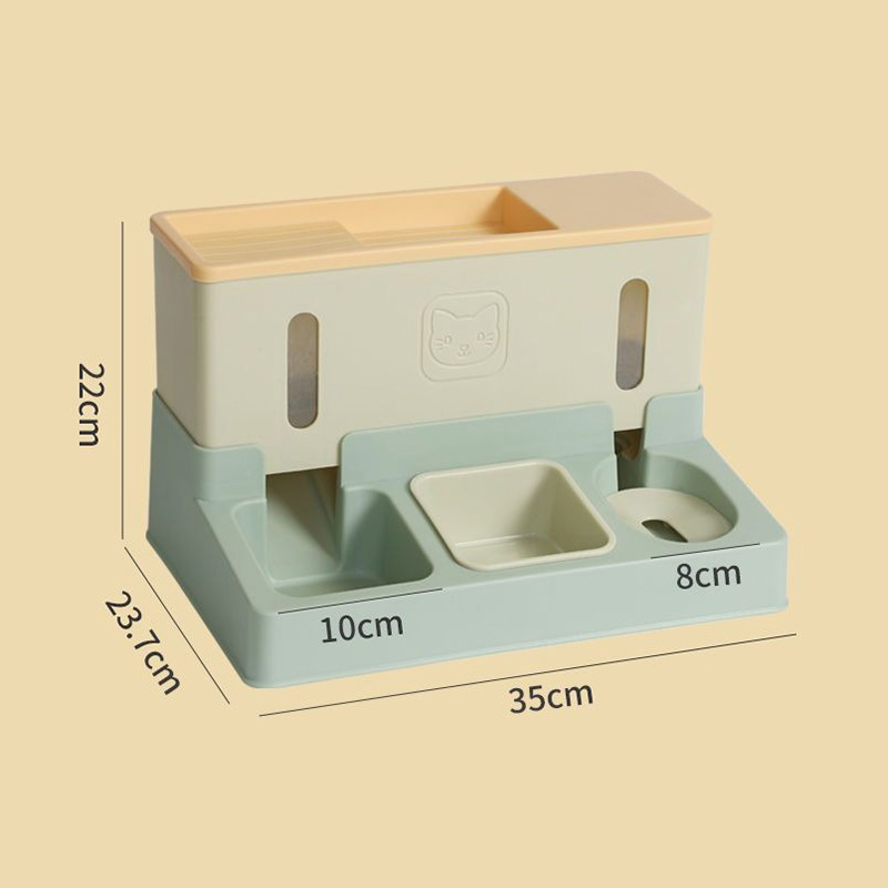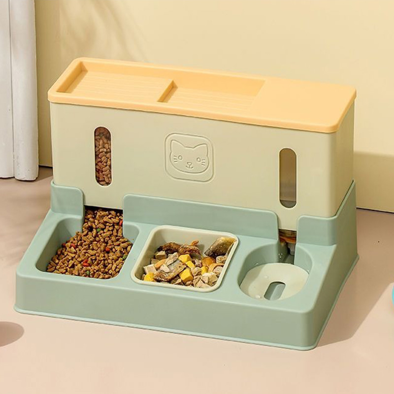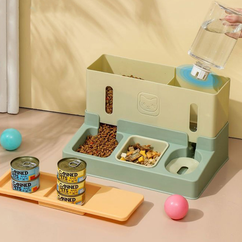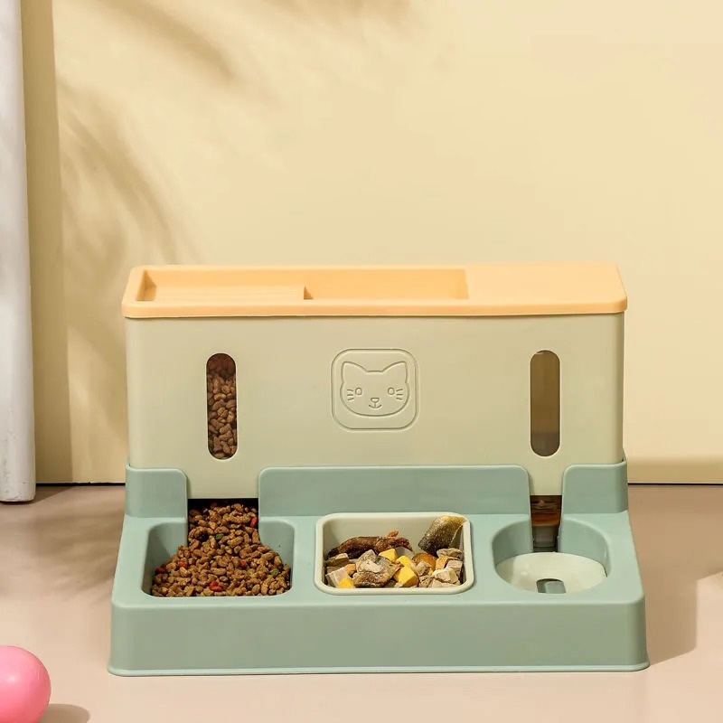 The feeder features two separate compartments, one for dry food and another for wet food, allowing pet owners to provide a balanced diet for their pets. The design is practical, with a raised platform that helps to keep the food clean and dry, reducing the risk of contamination from the ground. The house-shaped design not only adds an aesthetic appeal to the product but also provides a sense of security for pets, making them more comfortable while eating.