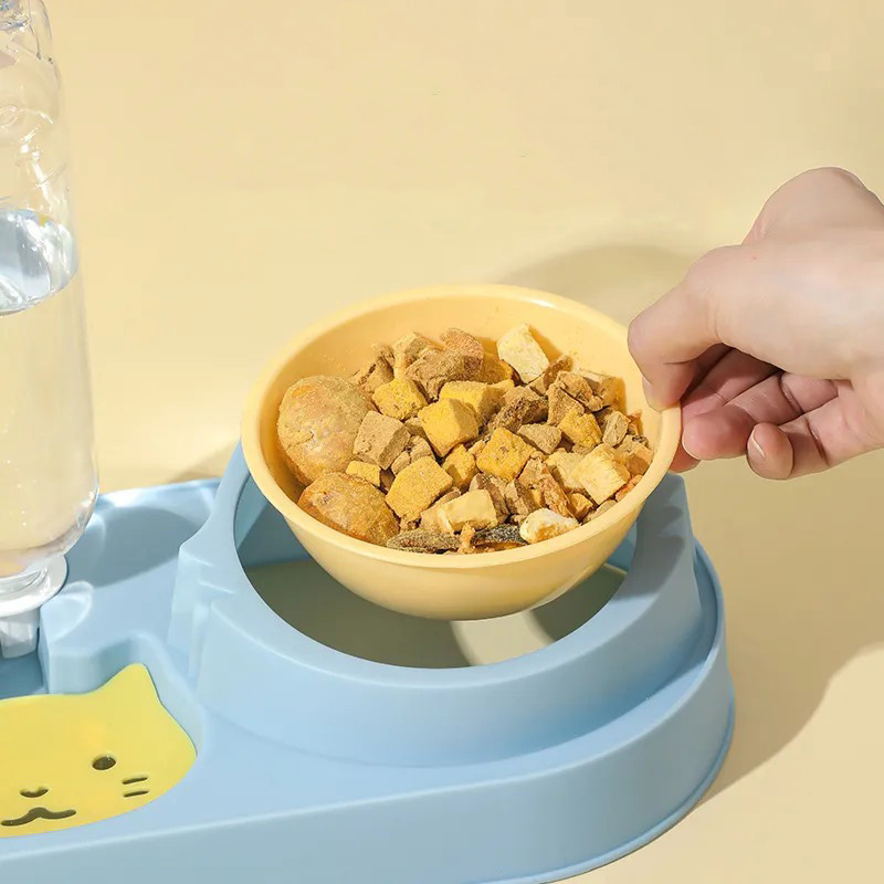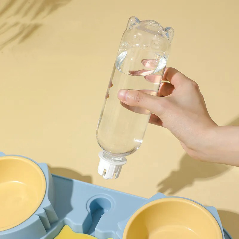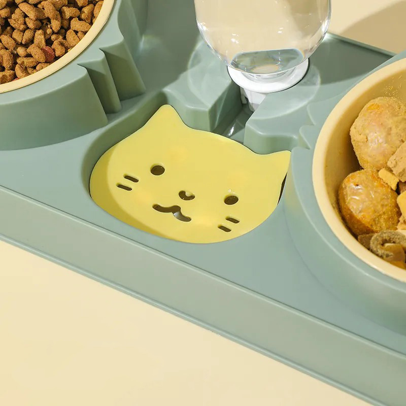 Introducing our versatile and stylish Cat Whiskers Pet Feeding Set, designed to meet all your pet's feeding and hydration needs in one convenient package. This set includes two bowls and a water dispenser, all neatly arranged on a single tray for easy access and cleaning.