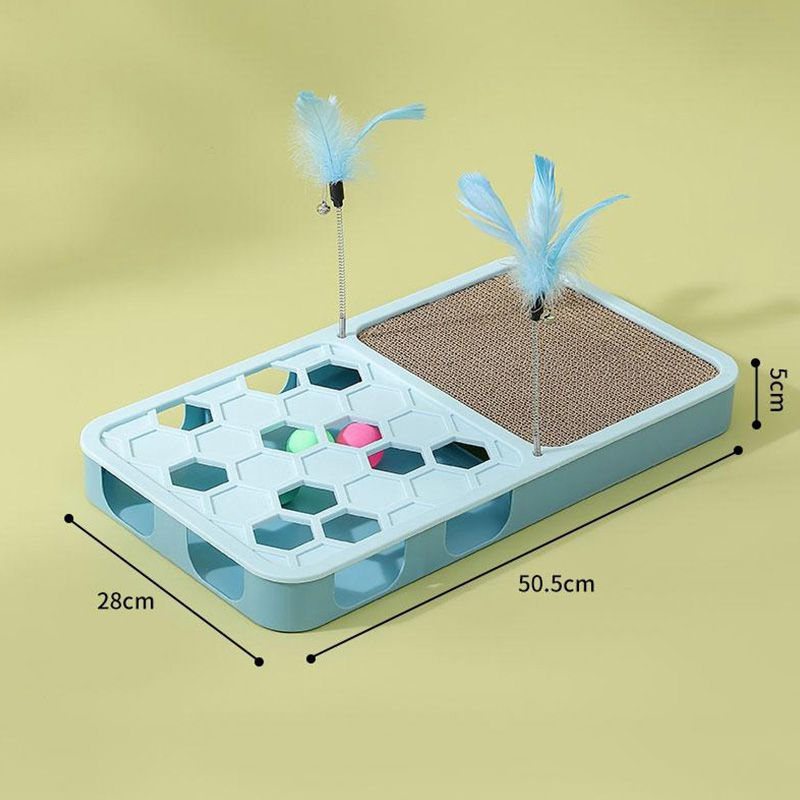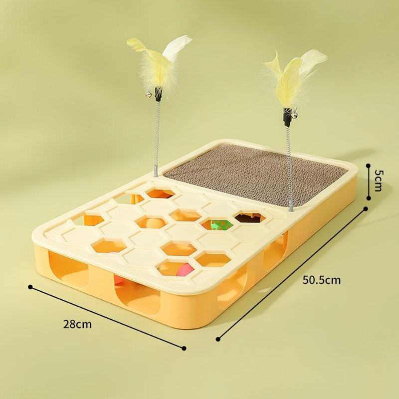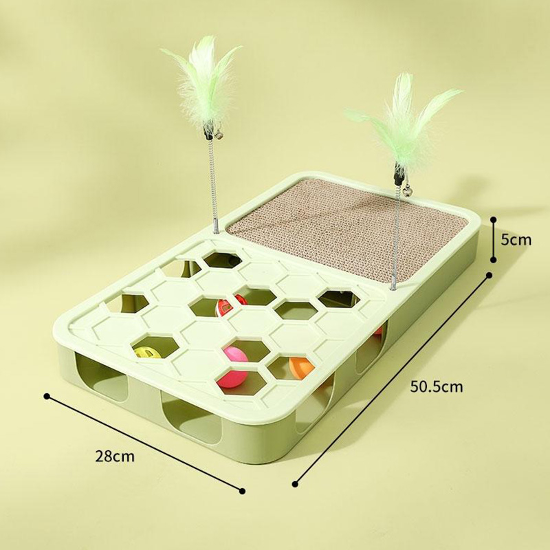 The scratching post area is durable and resistant to biting and scratching, maintaining its shape even with long-term use. It satisfies the cat's natural instinct to sharpen its claws without needing frequent replacement. It comes with two feather teaser wands with bells, which make a sound with a gentle shake, instantly arousing the cat's hunting instincts. The honeycomb-shaped holes in the middle allow for interactive ball play, adding to the fun.